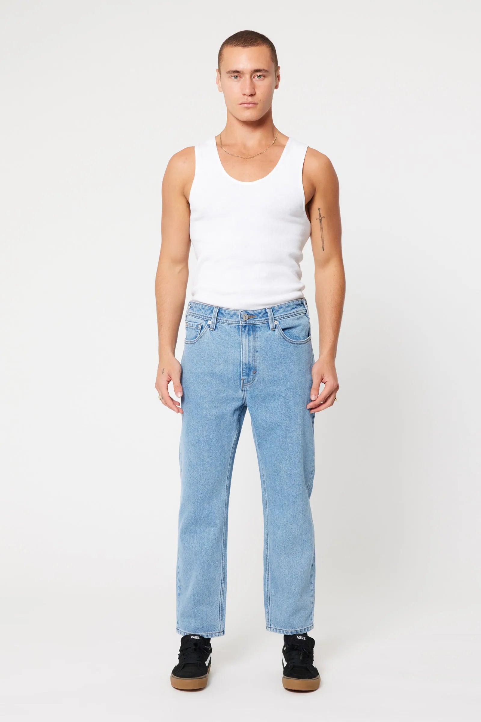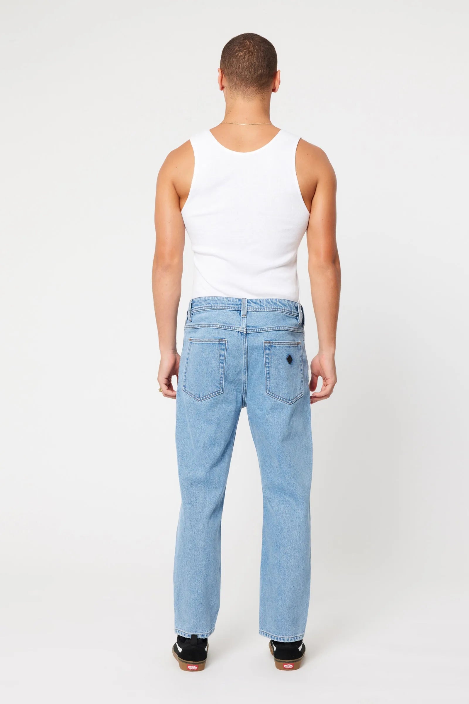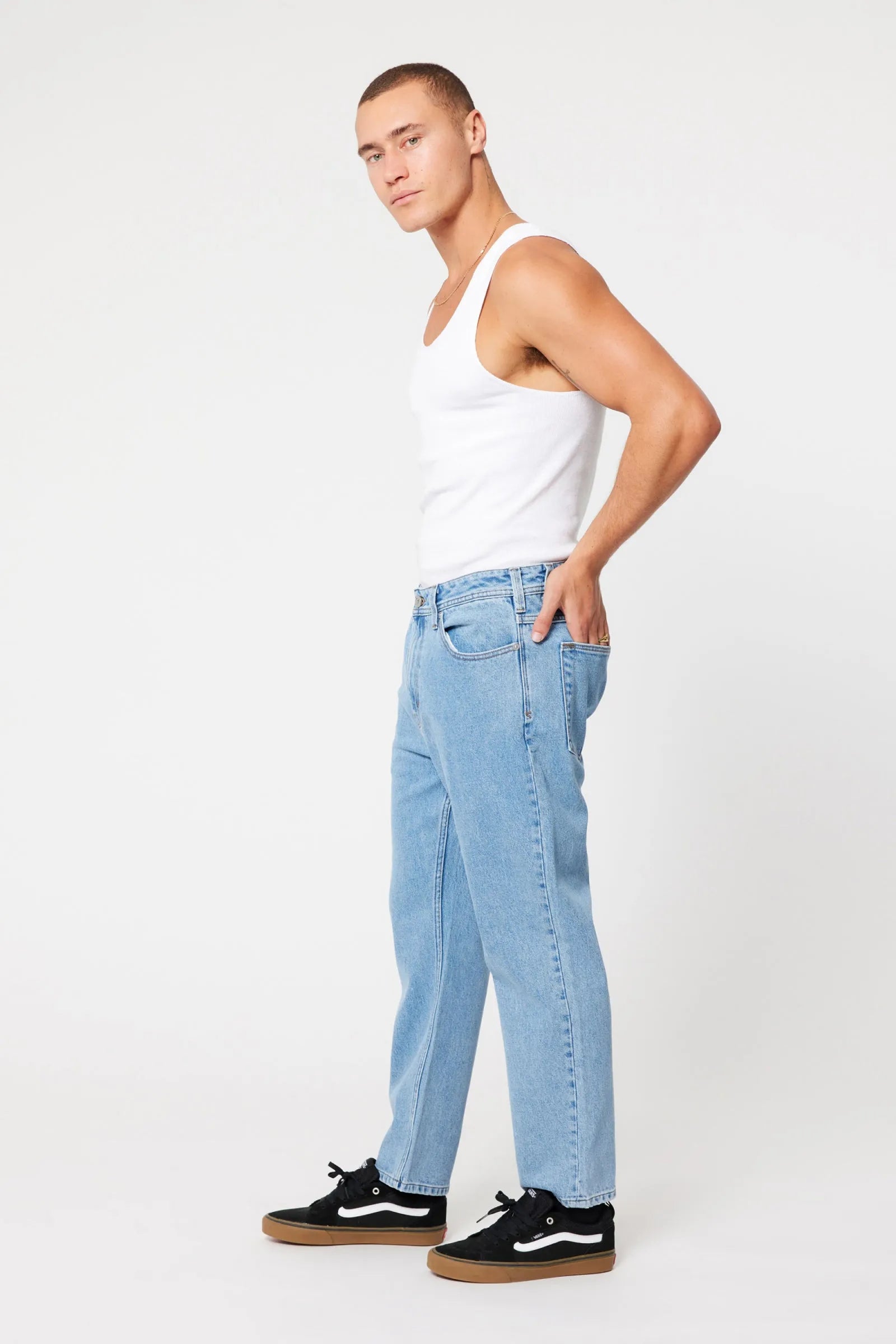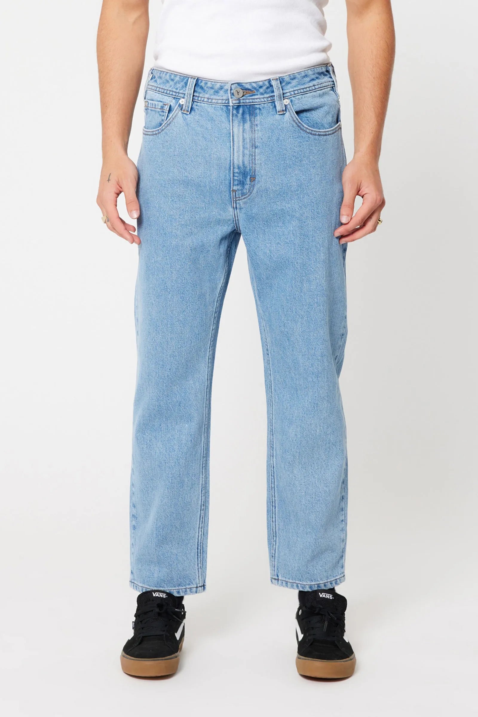 The A3 Crop in Simon feature a regular rise and a relaxed fit through the seat, with a straight-leg profile that finishes cropped just above the ankle for a clean, effortless look.