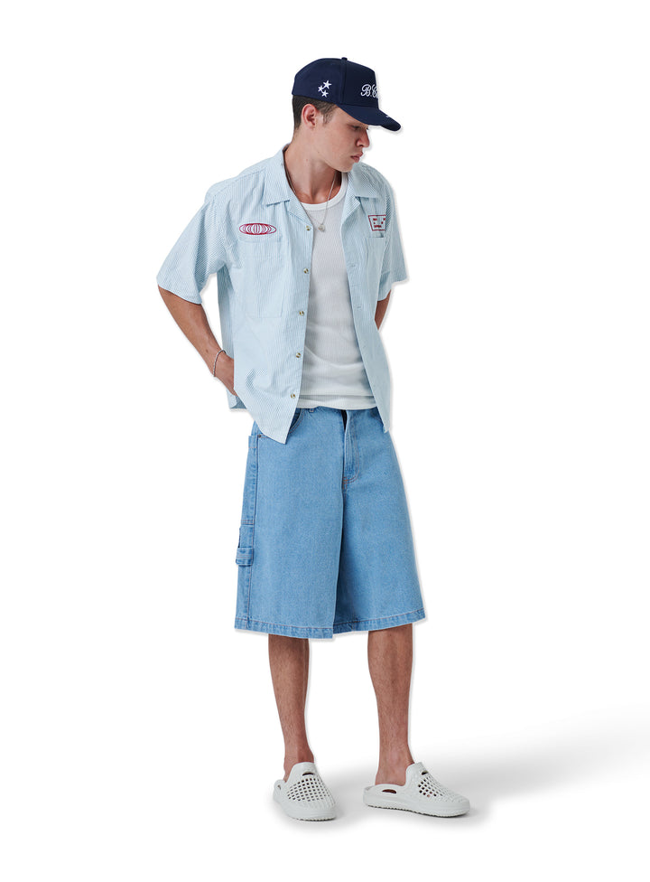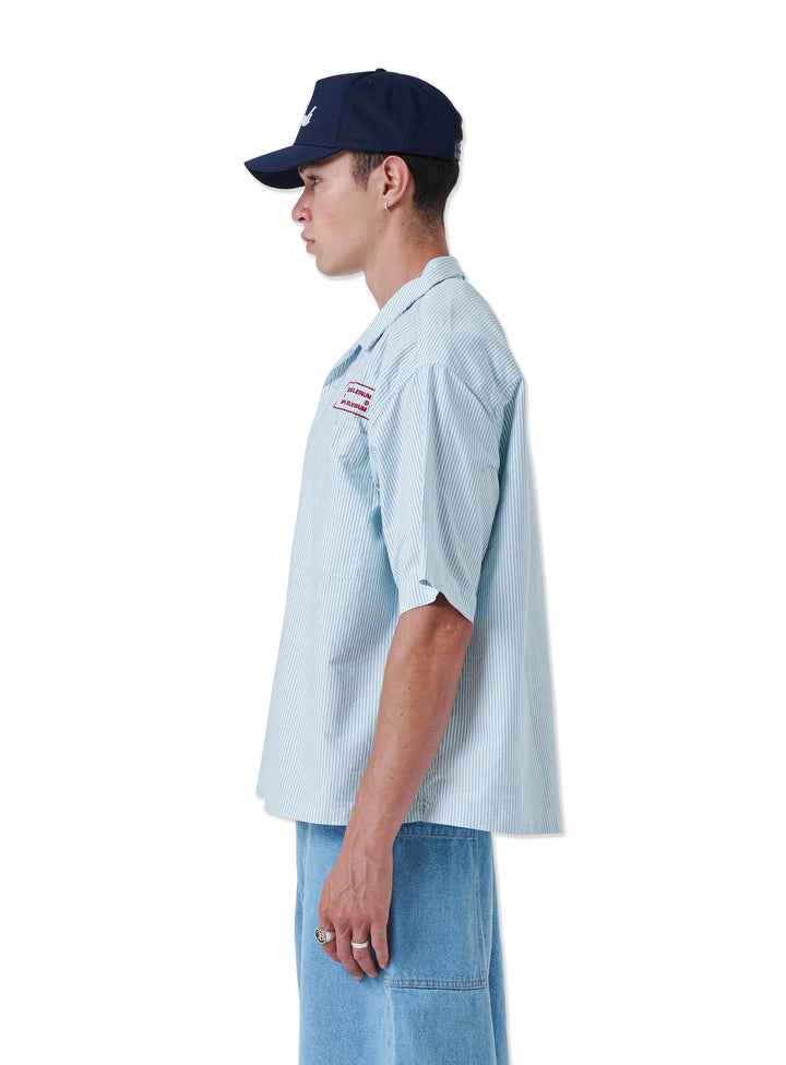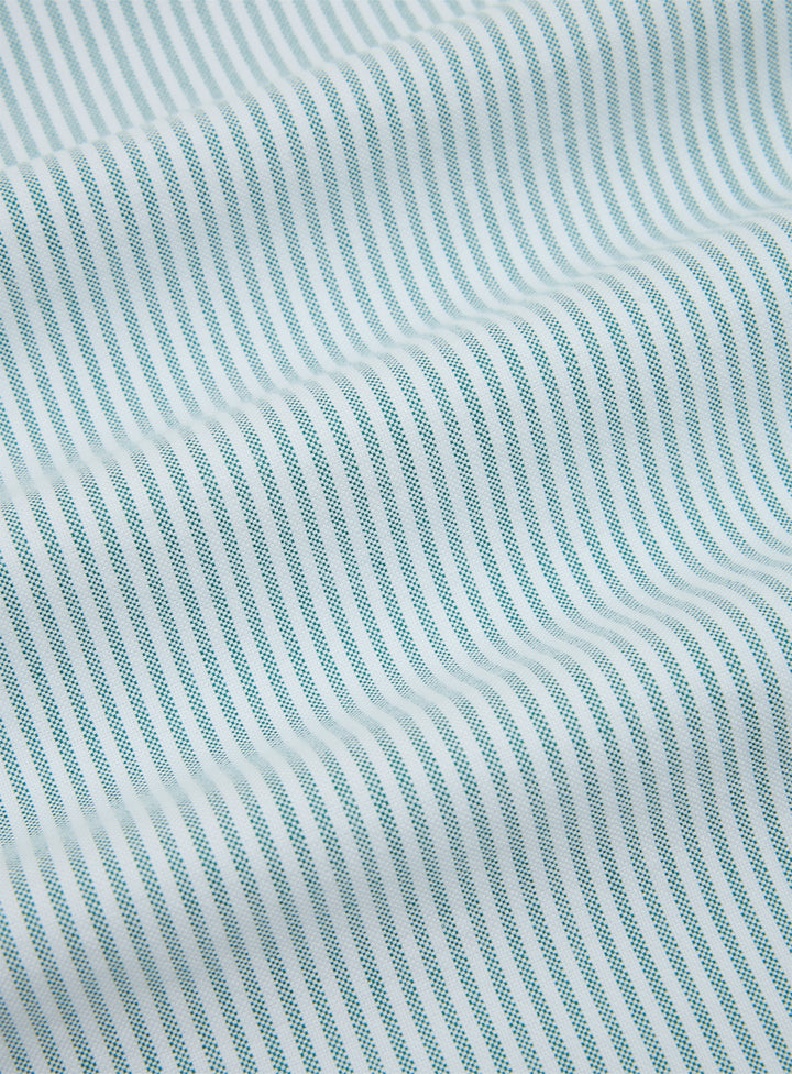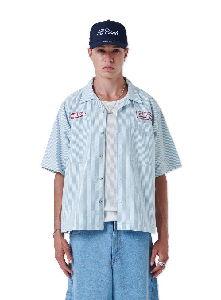 The Atlas Shirt. Green stripe oxford fabric with chest embroideries. Boxy fit, resort collar and shorter length.