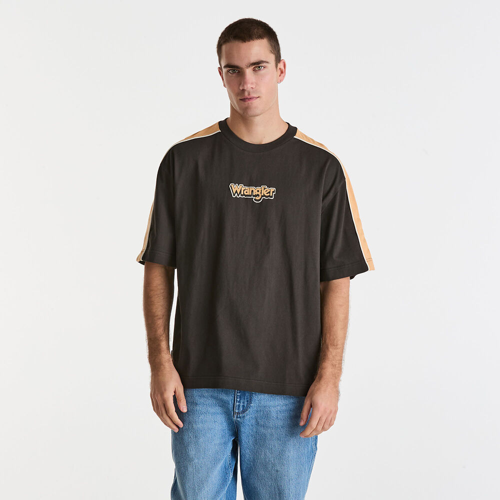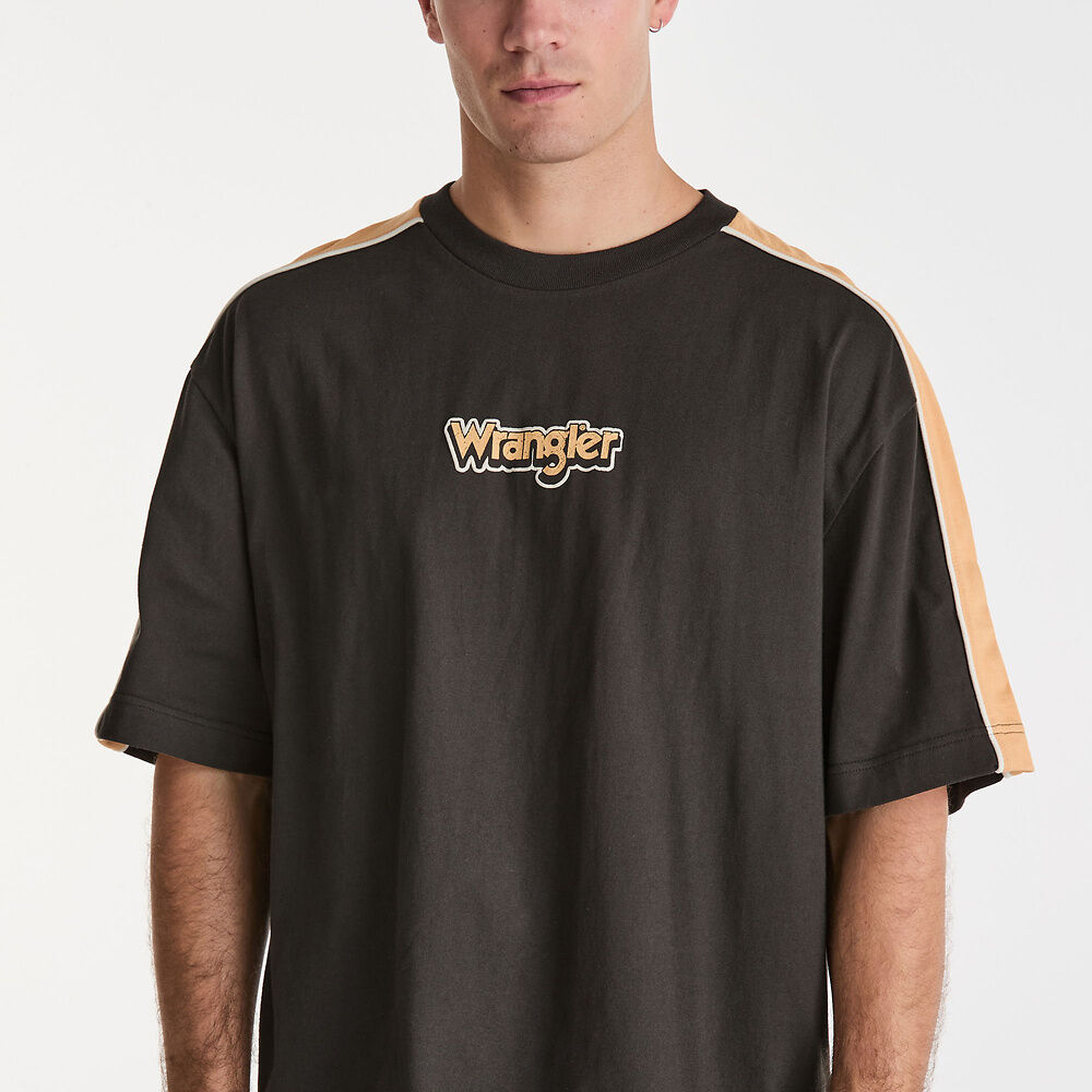 The Boxcar Panel Tee has been designed with a relaxed top block and but with a shorter length to sit on the waistband. Crafted in a heavy weight, cotton with a soft hand feel. Featuring a high density embroidered Wrangler graphic logo and contrast panel sleeve detail.