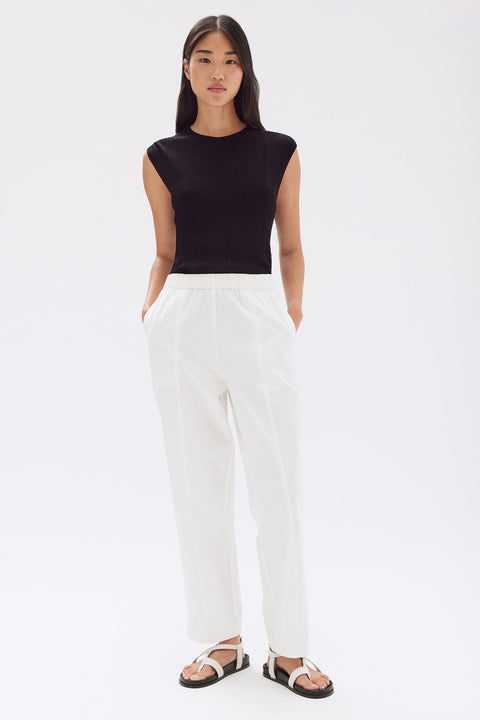 Classic pant with elasticated waist band. Features a front and back design panel for added interest.