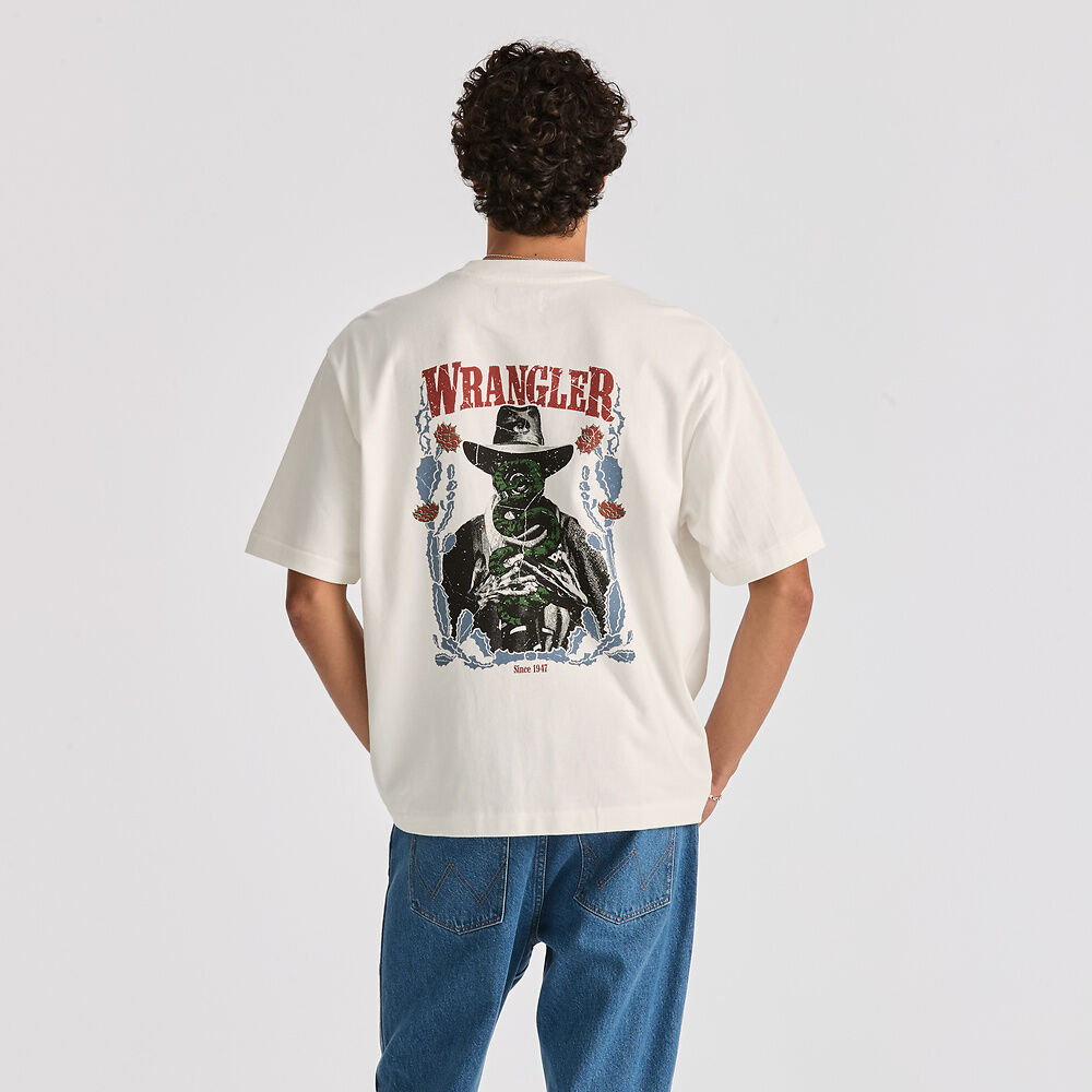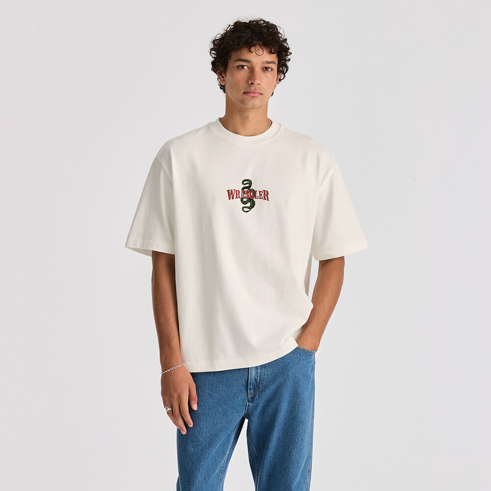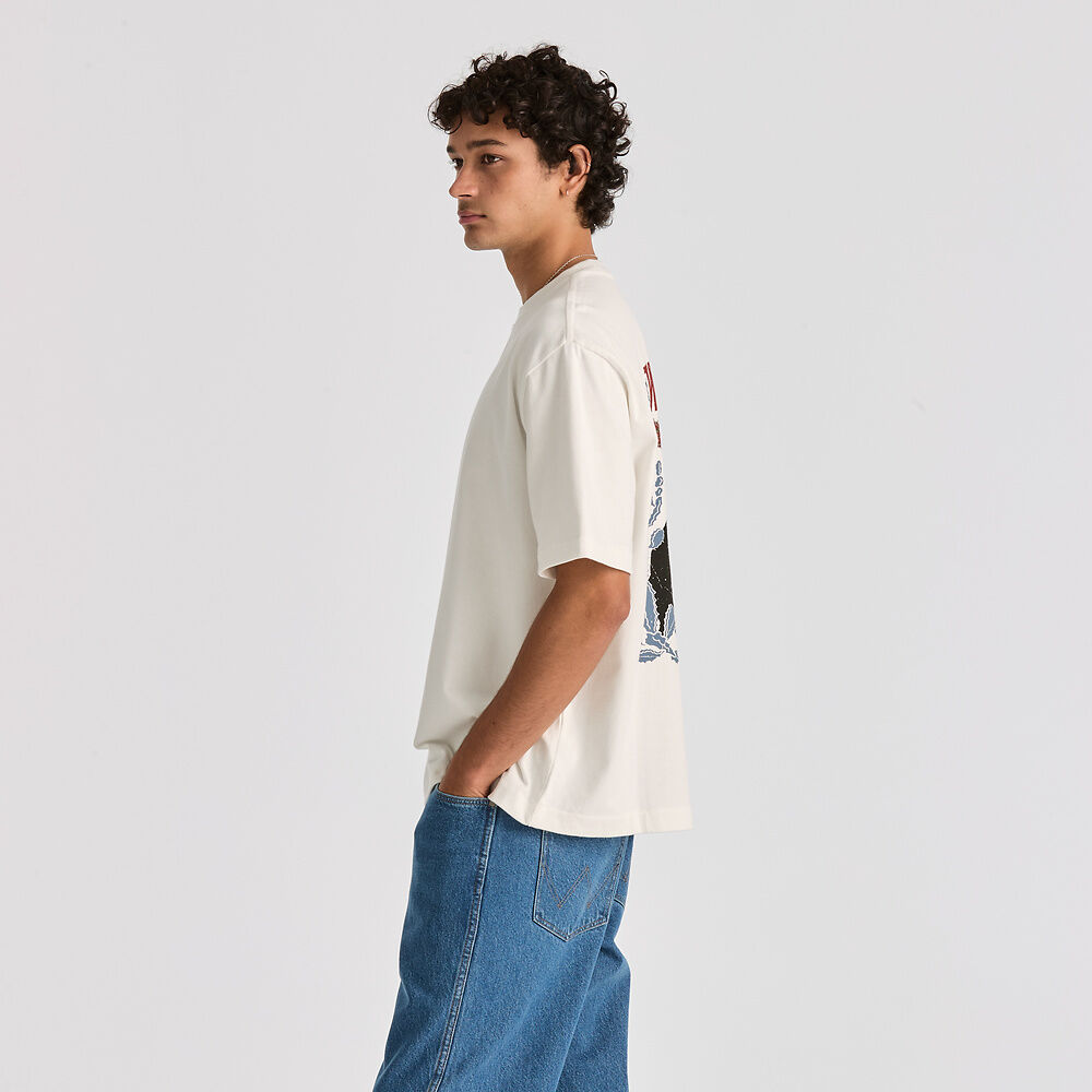 Our Boxcar Tee is a new addition to our fit library. Cut with a shorter length, the Boxcar Tee has been designed with a relaxed top block to sit on the waistband. Crafted in a heavy weight cotton jersey with a soft hand feel. Featuring a centre chest logo and back graphic.