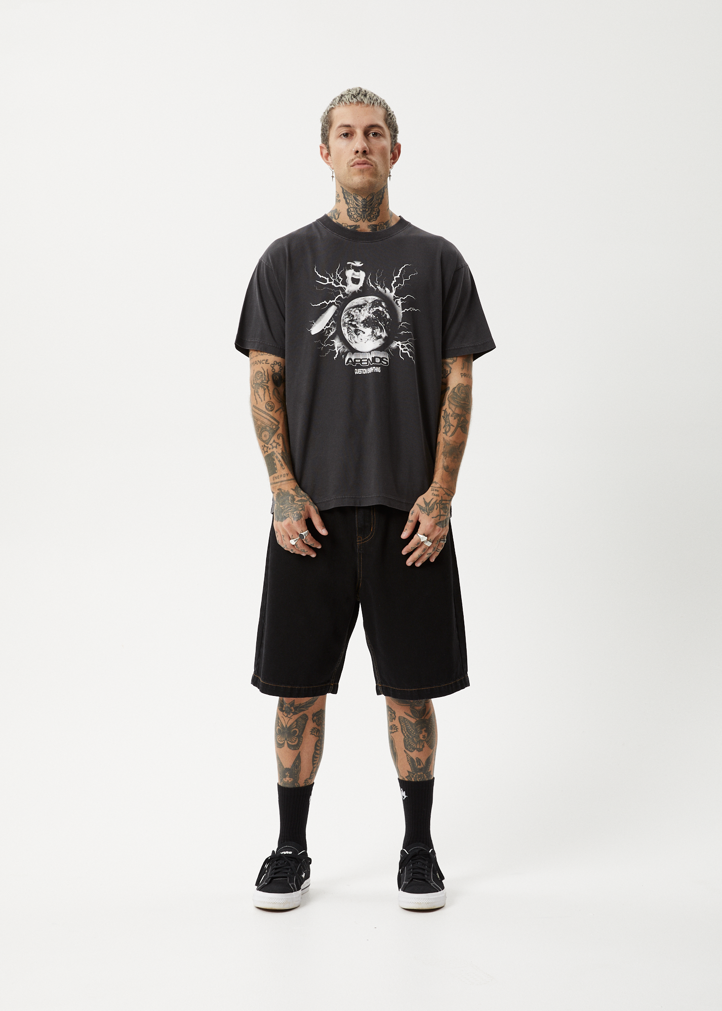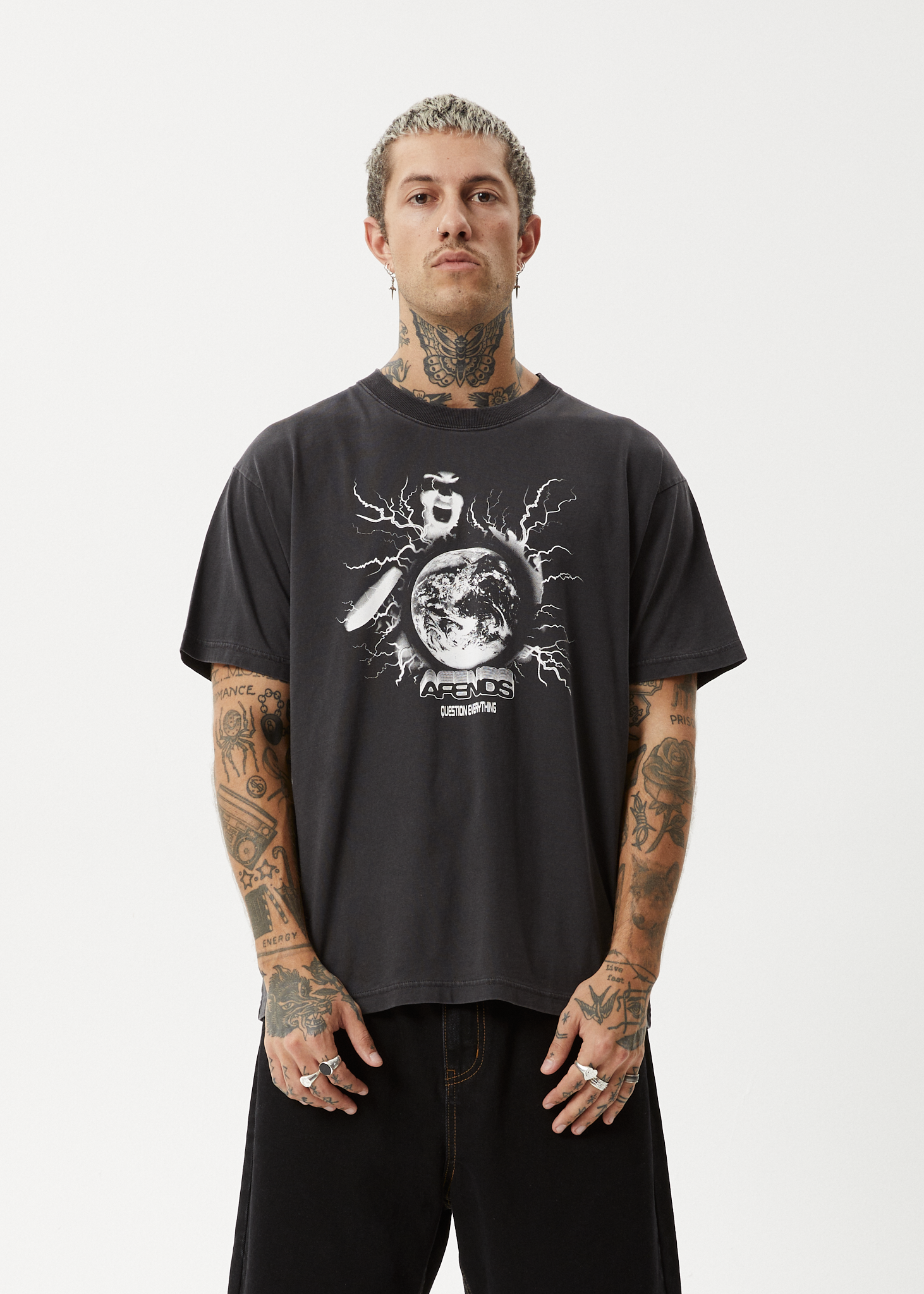The "Doom Gen" Tee offers a boxy fit with an in house designed plastisol printed artwork and a ribbed neckline, combining contemporary design with an edgy flair.