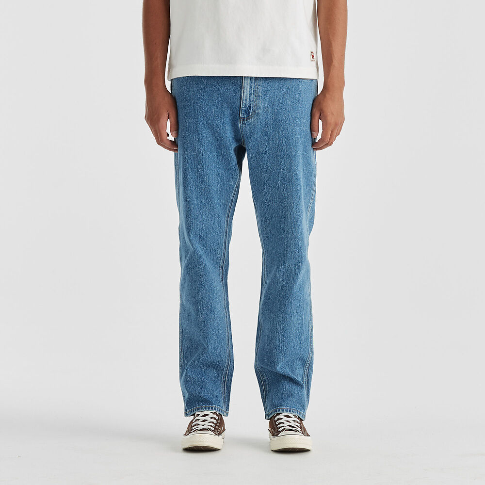 Our Eazy Straight fit is inspired by our classic straight leg jeans from the Wrangler archive library. Modernised for today with a square top block, they fall from a neat straight leg down to a considered leg length for a clean finish on your shoe. Made up of a vintage mid tone indigo they feature in a rigid denim with traditional Wrangler heritage inspired stitching and finished with vintage worn metal hardware.