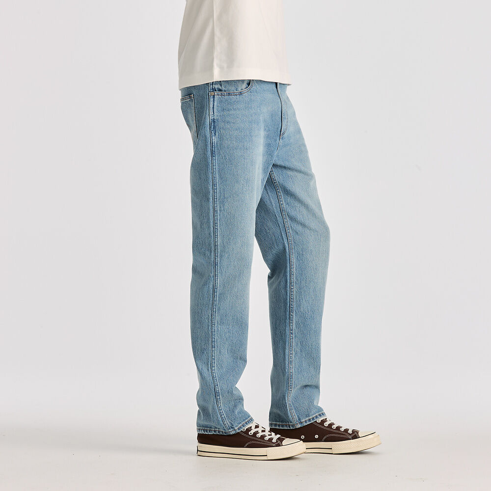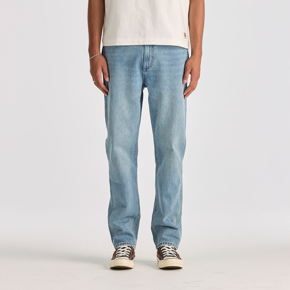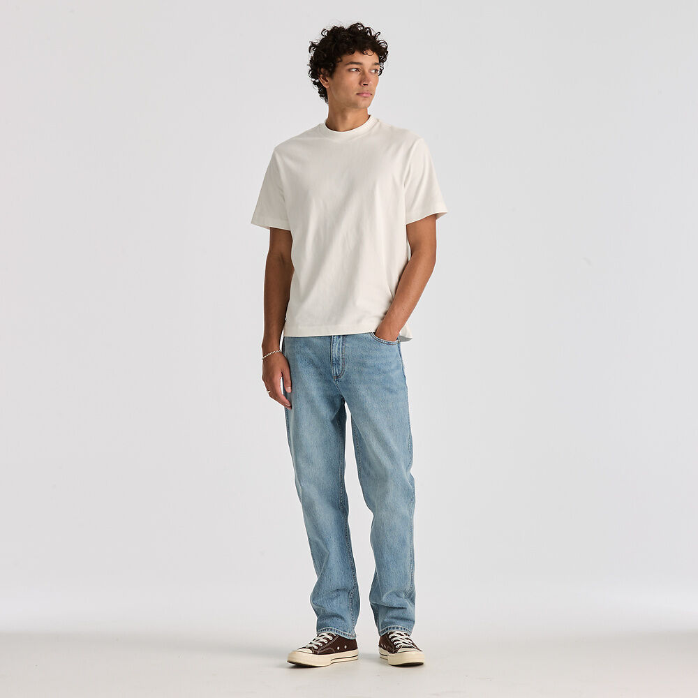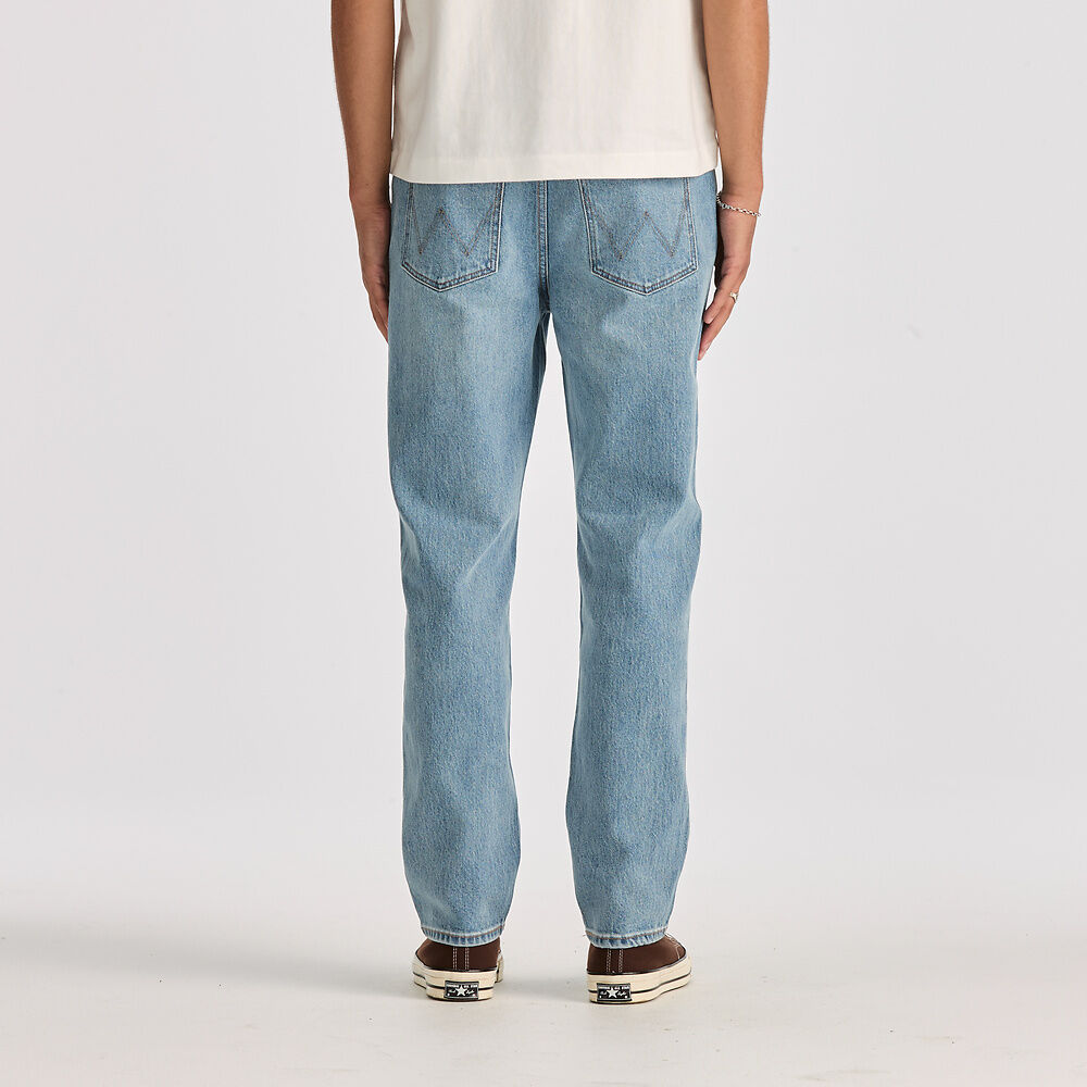 Our Eazy Straight fit is inspired by our classic straight leg jeans from the Wrangler archive library. Modernised for today with a square top block, they fall from a neat straight leg down to a considered leg length for a clean finish on your shoe. Made up of a vintage light tone indigo they feature in a comfort rigid denim with traditional Wrangler heritage inspired stitching and finished with vintage worn metal hardware.