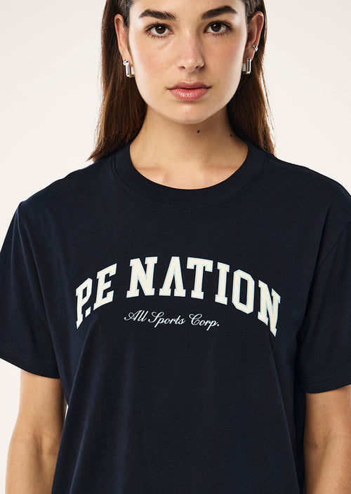 The Heritage Tee in Dark Sapphire is crafted in our new midweight ,100% organic cotton jersey fabrication. This relaxed fit crew neck tee features a P.E Nation seasonal logo at the center front. Wear yours with active leggings for an easy athleisure look.