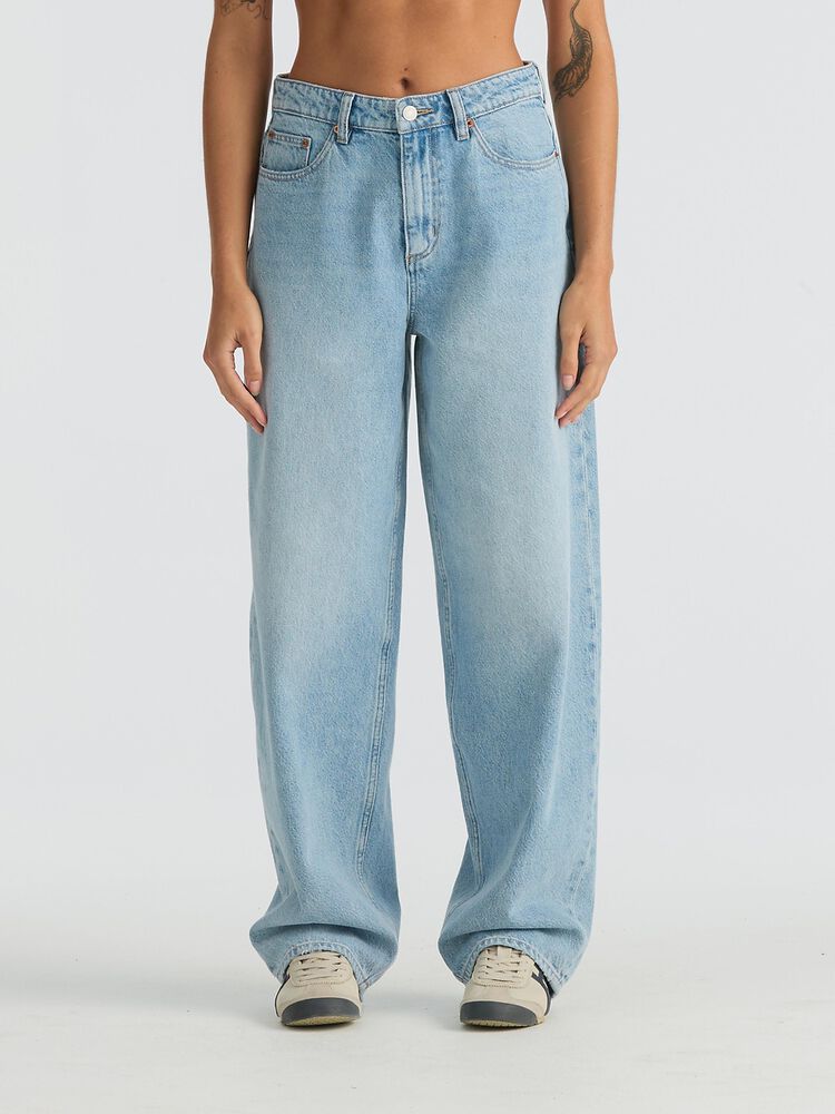 The Mid Baggy Taper is out take on a gentle barrel leg profile. Designed with a mid rise, square top block and full leg profile that tapers to seat neatly on your shoe. Made in a non stretch, light indigo wash denim.