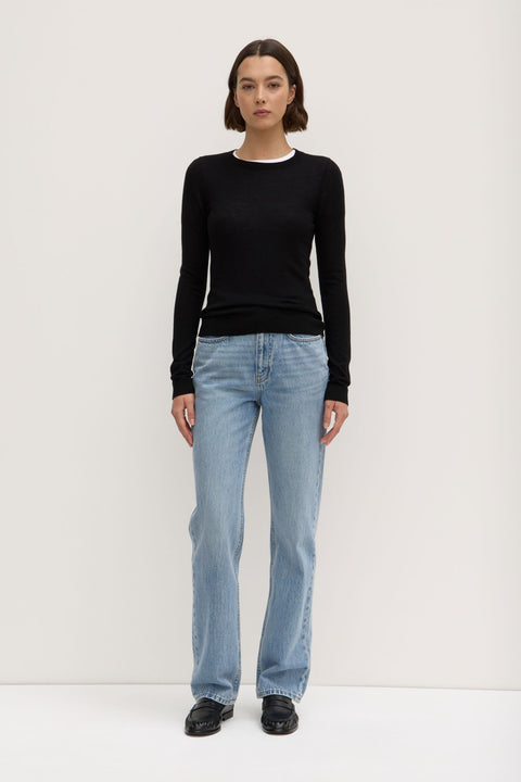 Elevated long sleeved merino wool top featuring ribbed detailing on trims. Can be styled alone or layered underneath outerwear.
