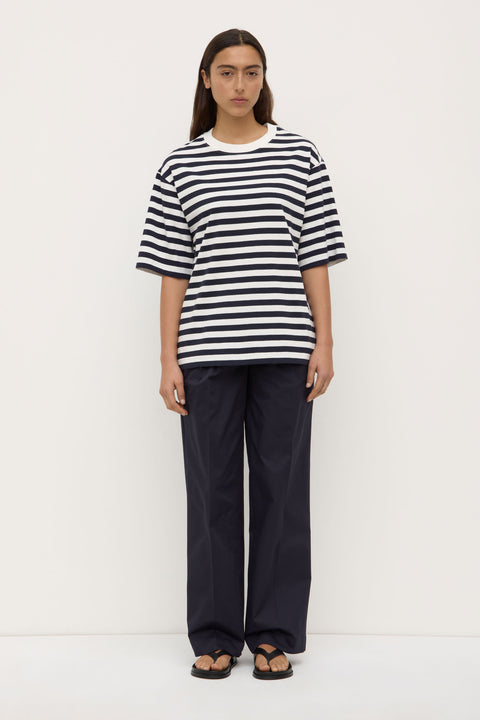 Relaxed fit short sleeve tee crafted from a midweight cotton. Features a striped design with a contrast ribbed neckline.