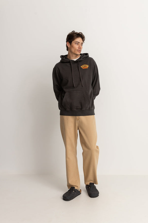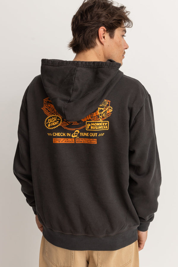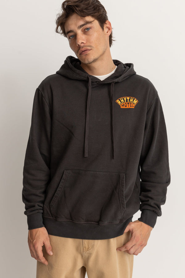 A Rhythm staple, discover the Motel Vintage Fleece Hood a comfy, classic fleece featuring jersey lined hood, hand pockets and rib hem and sleeve cuff. Dyed black with an enzyme wash for that vintage look and feel, complete with screen printed old school surf artwork. perfect for crisp mornings and cooler summer nights.