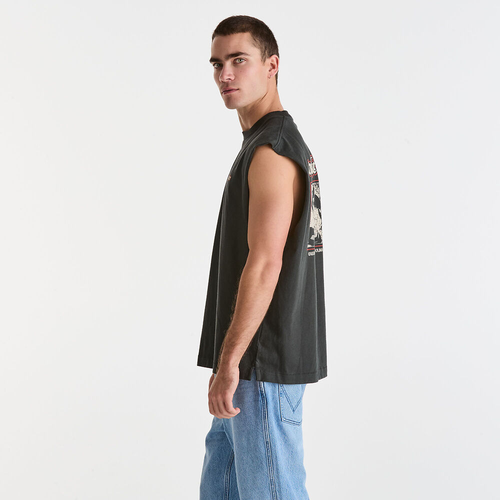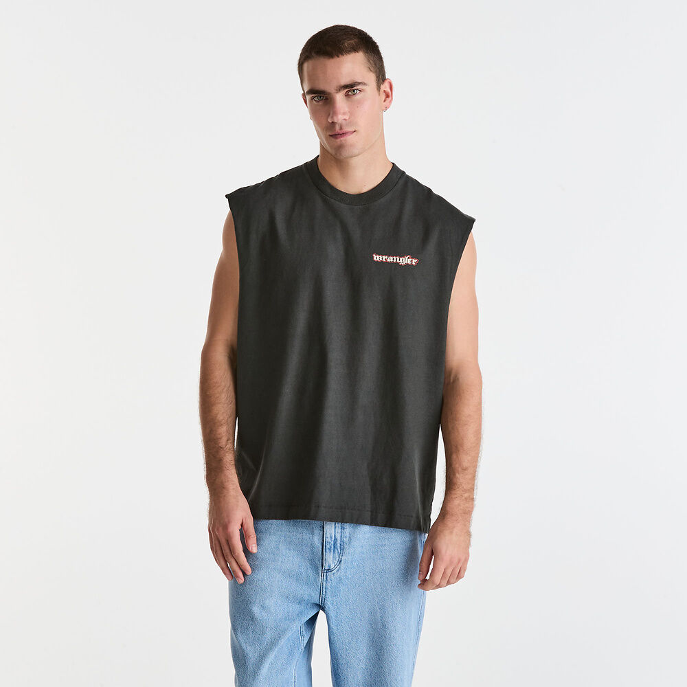 The boxcar muscle tee is a boxed cropped, baggy fit muscle, made in a cotton jersey with a soft hand feel