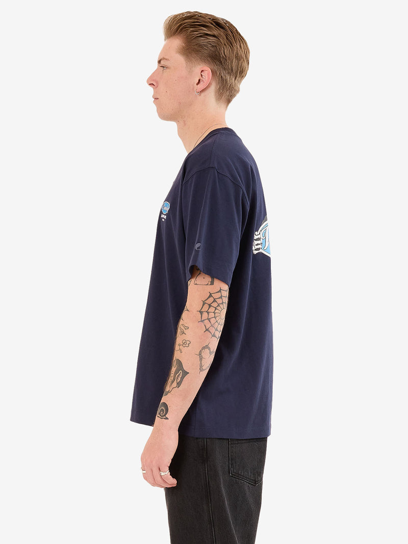 - The Observer Tee in Peacoat balances everyday comfort with a distinctive, edgy branding details. Made from 245gsm cotton jersey, it features puff print and embroidery hits across the front and back for a textured, standout finish. The relaxed fit and deep navy tone make this men's tee an easy everyday option, while the graphics bring a subtle touch of vintage inspiration.