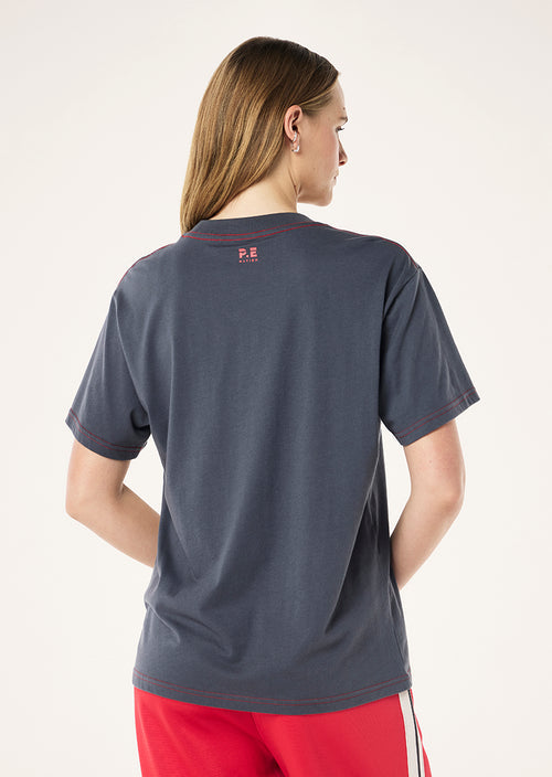 The Shift Tee in Marine Blue is made from a mid-weight 100% cotton jersey. This relaxed fit tee features a twin needle contrasting hem and P.E Nation logo on front and back.