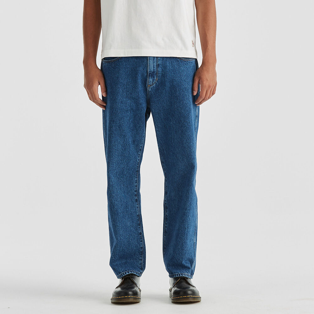 The Slacker jean is our relaxed straight fit. Designed to sit low, with a relaxed top block and leg. Made in a deep indigo wash, they feature in a rigid denim with heritage inspired stitching and vintage metal hardware.