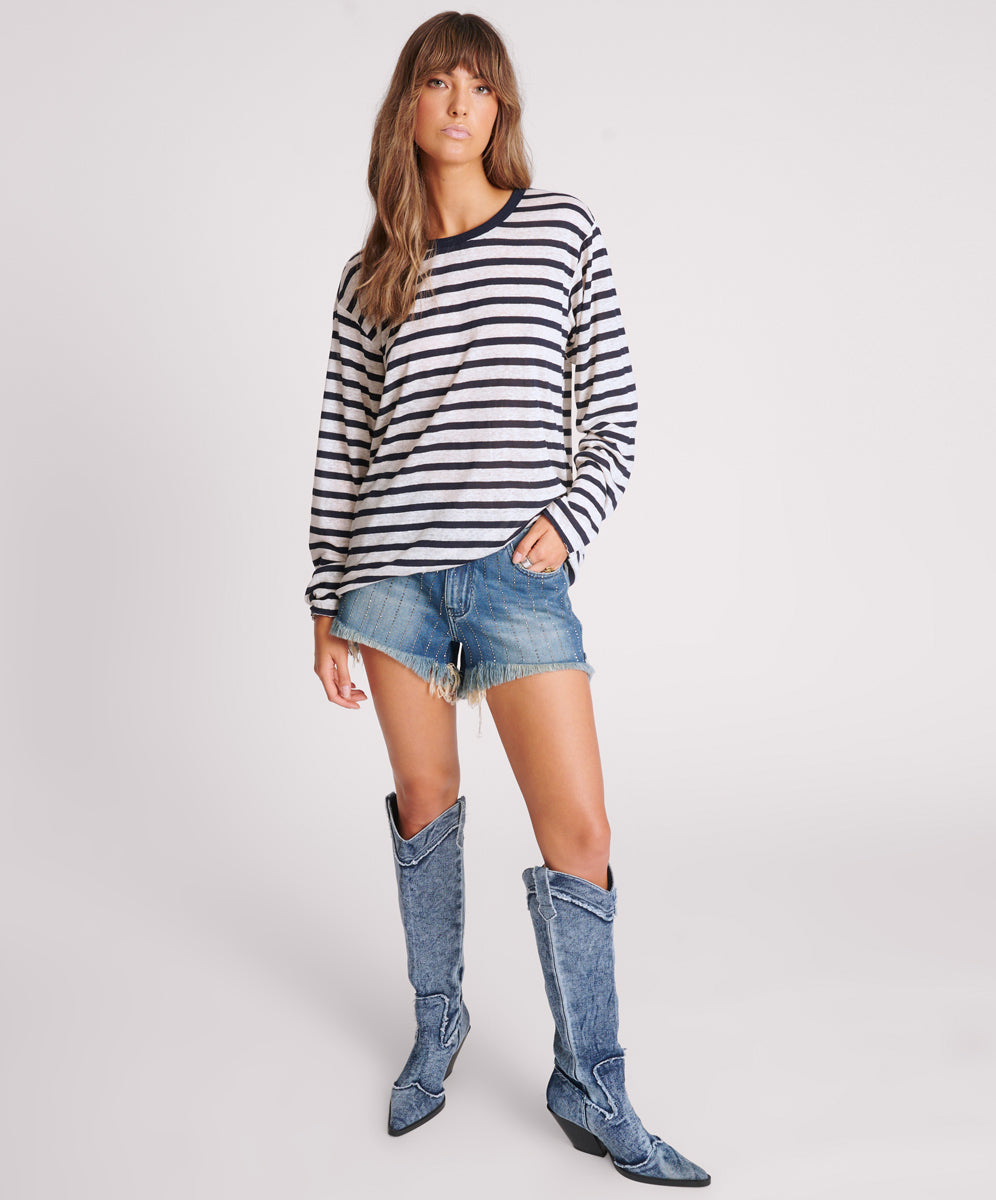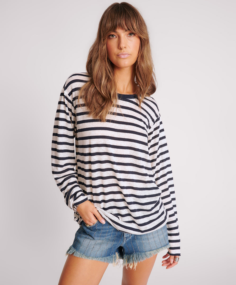 The LINEN YARN DYE STRIPE LONGSLEEVE BOYFRIEND TEE is a classic staple to any wardrobe. Super soft ivory and navy stripes on an oversized classic tee with a relaxed neckline. Casual, dressed up, working out or simply lounging in your house.