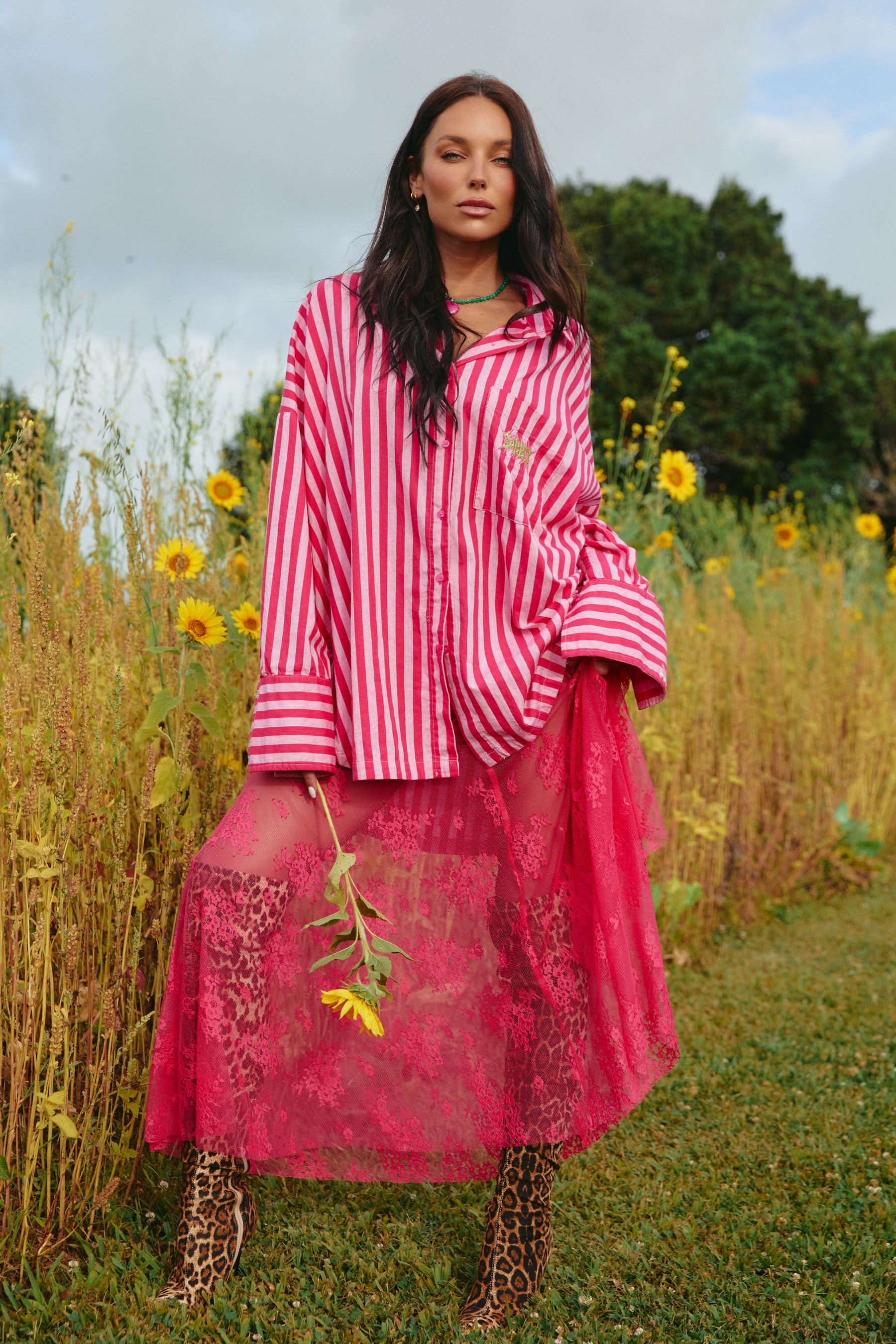 Crafted in bold vertical stripes of punchy pink and fiesta red, she's your go-to for sun-kissed days, road trips with the girls, market strolls and beach-to-bar moments. Soft, breathable, and designed to drape just right, this shirt serves relaxed luxury with a cheeky wink.