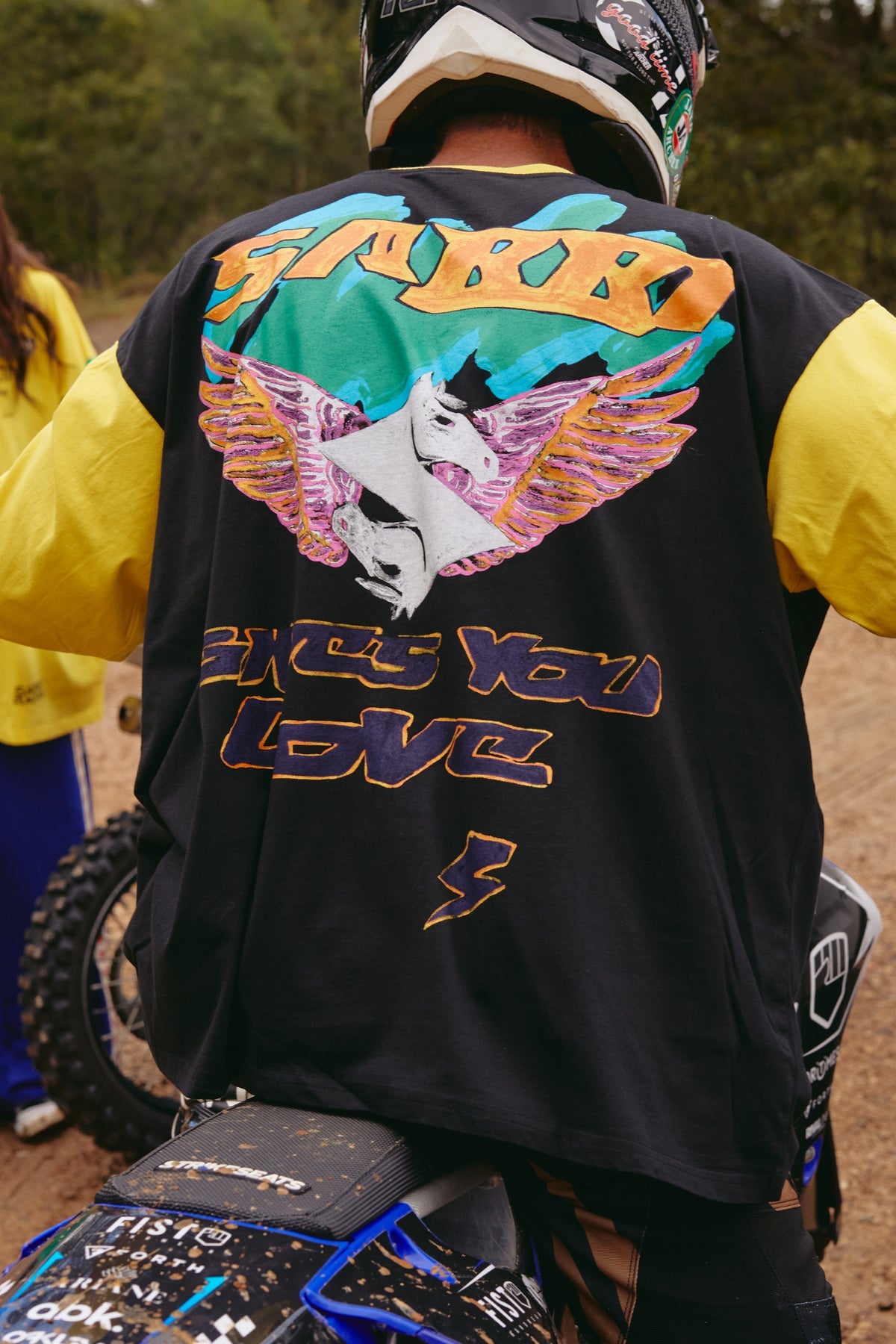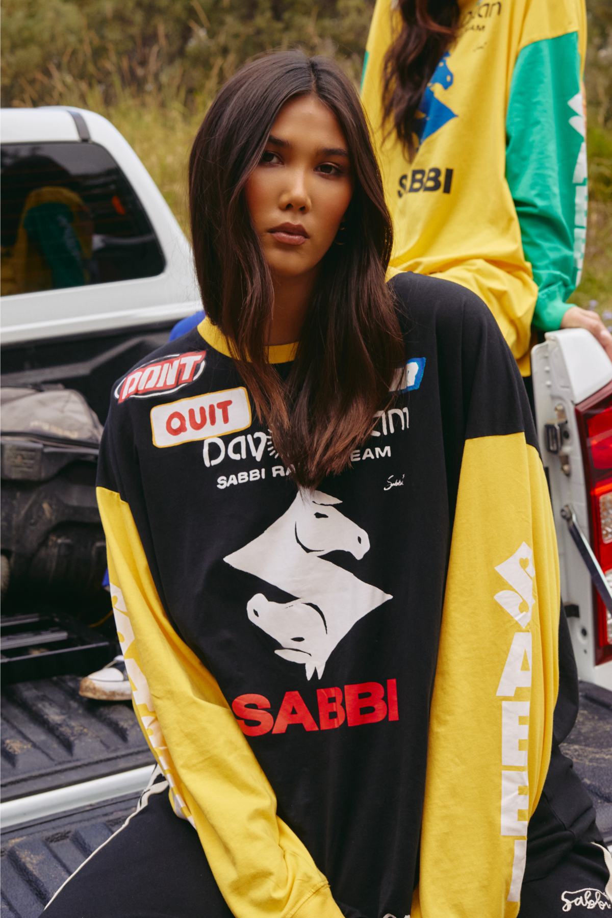 Washed, worn, and ready to ride. Our long sleeve vintage tee is giving main character at the track vibes. It’s made from 100% cotton, enzyme washed to feel like you’ve had it since your first race, and finished with bold colour blocking, a statement front & back print with Sabbi arm prints.