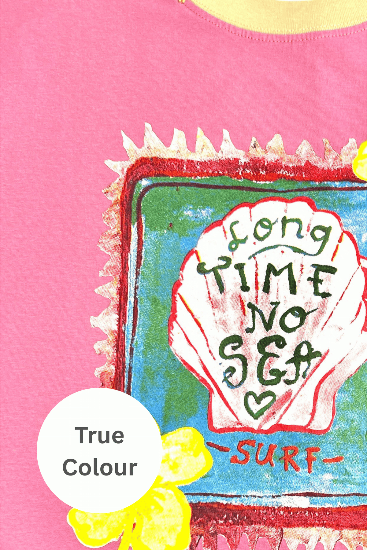 - Hand-drawn Long Time No Sea shell artwork on front
